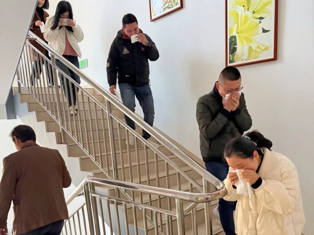理論授課結束后,一場無預告的實戰(zhàn)演練隨即拉開帷幕。隨著尖銳的警報聲突然響起,演練正式啟動。集團副總經理黃曉斌擔任此次演練的總指揮,迅速統(tǒng)籌協(xié)調各項工作。在疏散引導員的有序指揮下,全體員工保持冷靜,用濕毛巾或衣物掩住口鼻,采取彎腰低姿的正確姿勢,沿著預定疏散路線快速、有序地向室外安全區(qū)域撤離。整個疏散過程緊張而有序,最終僅用 3 分鐘便完成了全員安全撤離,充分檢驗了集團應急疏散預案的科學性與可操作性,也展現(xiàn)了員工們良好的應急反應能力與協(xié)作精神。